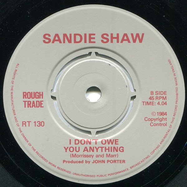 Sandie Shaw sings Smiths songs in place of Morrissey. Recorded at Matrix (London) Feb 1984. The tracks reappear on The Smiths 1992 "[r=490548]" reissues. On back sleeve: ℗ © 1984 Rough Trade Records Ltd. On label: © 1984 Copyright Control Made in England Push-out centre labels. Runouts are stamped except for etched JM, KISS MY SHADES, timtom and TY.