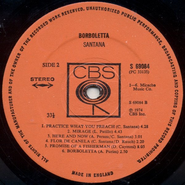 Metallic foil cover Enclosed sheet with credits "Borboletta" sticker may appear on front or rear © 1974 CBS Inc. ℗ 1974 CBS Inc. [Cover] Made in U.S.A. [Labels] Made in England Micache Music Co. Catalog numbers: S 69084 - labels 69084 - front cover, spine PC 33135 - labels (US catalog number)
