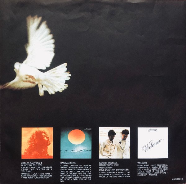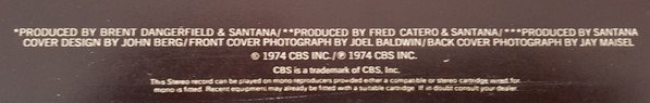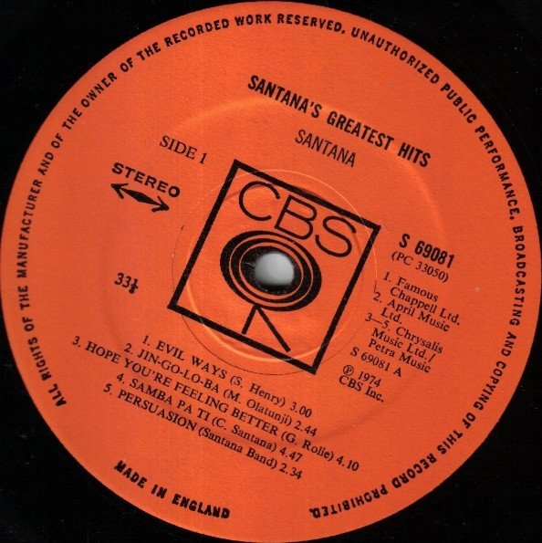Comes with a printed inner sleeve. (Black background, white pigeon and other Santana albums at the bottom) Has the cat. # as CBS 69081 on the rear and spine of the sleeve. Has track A2 as "Jingo" on the sleeve but as "Jin-Go-Lo-Ba" on label. Shorepak by Shorewood Packaging Co. Ltd. England