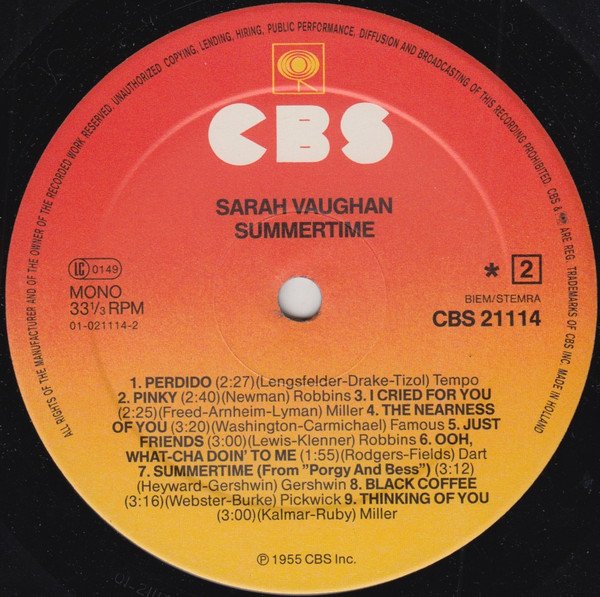 All tracks recorded at New York City: A1 to A8: May 18-19, 1950 B1: September 5, 1950 B2: September 19, 1951 B3: September 28, 1949 B4: December 21, 1949 B5: July 7, 1949 B6: January 5, 1953 B7: December 21, 1949 B8: January 20, 1949 B9: July 20, 1950 Publishers: A1: Gershwin Pub. Corp. / Chappell And Co., Inc. A2: Anne Rachel Music Corp. A3: Ahlert Music Corp. / Cromwell Music, Inc. A4: A-M Music Corp. A5: Southern Music Pub. Co., Inc. A6: Williamson Music, Inc. A7: Mills Music, Inc. / Anne Rachel Music Corporation A8, B2, B5: Robbins Music Corp. B1: Tempo Music, Inc. B3, B9: Miller Music Corp. B4: Famous Music Corp. B6: Dart Mus. Corp. B7: Gershwin Pub. Corp. B8: Pickwick Music Corp. ℗ 1955 CBS Inc. © 1984 CBS Inc. Distributed CBS Records/CBS Disques S.A. Made in Holland
