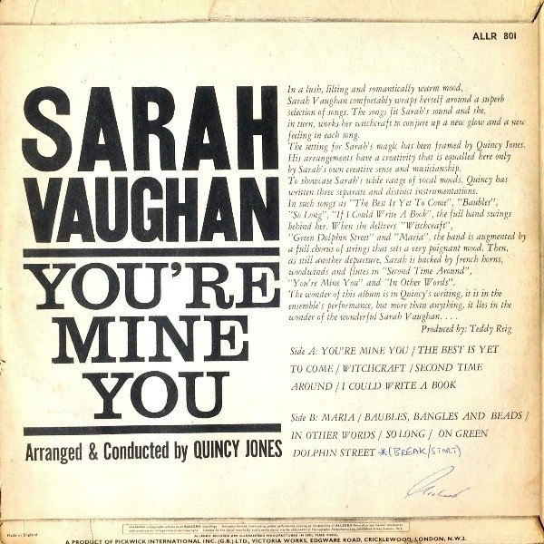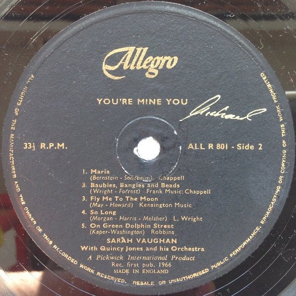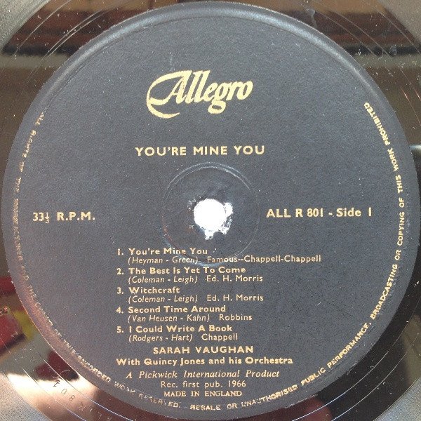 On the sleeve: (Allegro Records logo) in association with (Roulette Dynamic High Fidelity logo) ALLR 801 Allegro Records are guaranteed manufactured in 100% pure vinyl. A product of Pickwick International Inc. (G.B.) Ltd., Victoria Works, Edgware Road, Cricklewood, London, N.W.2. Made in EnglandOn the labels: Allegro ALL R 801 A Pickwick International Product Rec. first pub. 1966 Made in EnglandBy contrast to [r14550615], rim text is at bottom rather than top of labels.