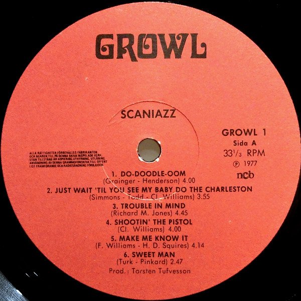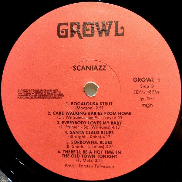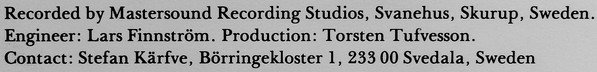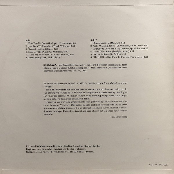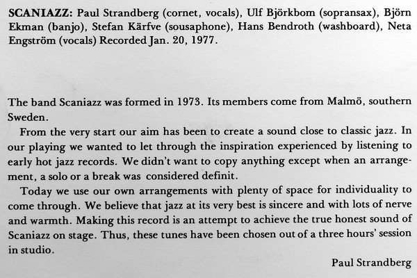 Recorded Jan 20, 1977. Recorded by Mastersound Recording Studios, Svanehus, Skurup, Sweden. Released in a non-laminated flip-back cover made of thick paper instead of cardboard. Track B1 is erroneously spelled as "Bogalousa Strut", but the original and correct spelling of the title as written by [a=Sam Morgan] is "Bogalusa Strut" and has been submitted correctly.