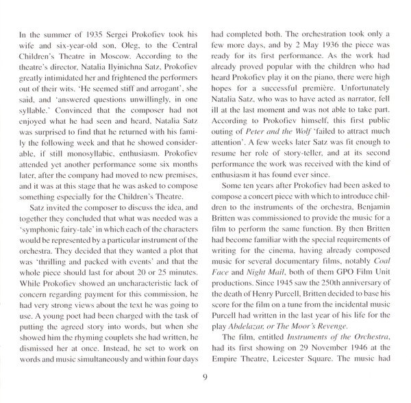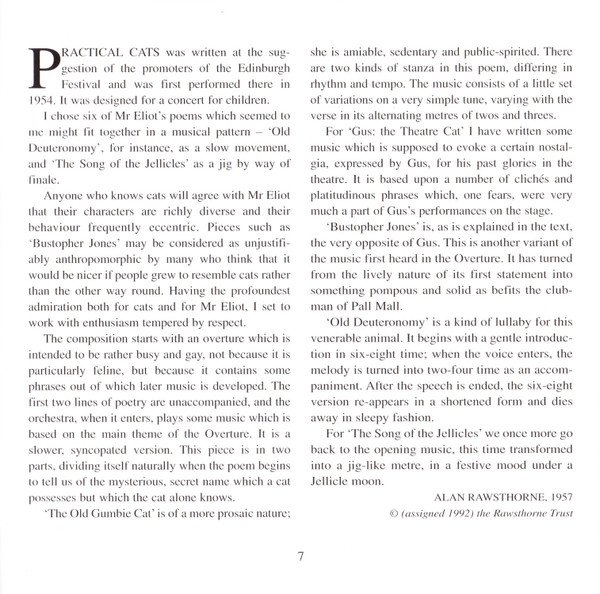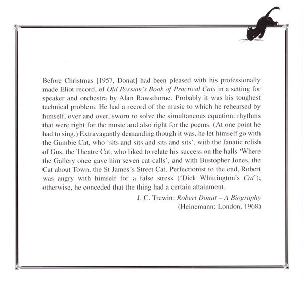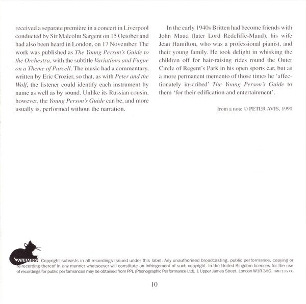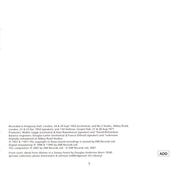 ℗ 1957 & *1971. Digital remastering ℗ 1998 & *1995 by EMI Records Ltd. This compilation ℗ 2007 by EMI Records Ltd. © EMI Records Ltd., 2007. Recorded in Kingsway Hall, London, 24 & 29 Sept 1954 (orchestra), and No.3 Studio, Abbey Road, London, 21 & 23 Dec 1954 (speaker); and * All Hallows, Gospel Oak, 27 * 28 Aug 1971. * = Variations and Fugue on a Theme of Purcell Op.34, tracks 19 to 39 Alan Rawsthorne liner notes © (assigned 1992) the Rawsthorne Trust J. C. Trewin liner notes 'Robert Donut - A Biography (Heinemann: London, 1968)' Peter Avis liner notes from a note © Peter Avis, 1990 Front cover: detail from 'Wolves in a Snowy Forest' Made in the EU Tracks 1 to 7 are Mono Tracks 8 to 39 are Stereo Released as a jewel case with a clear tray and a 12 page cover booklet. Page 2 of the booklet is blank.