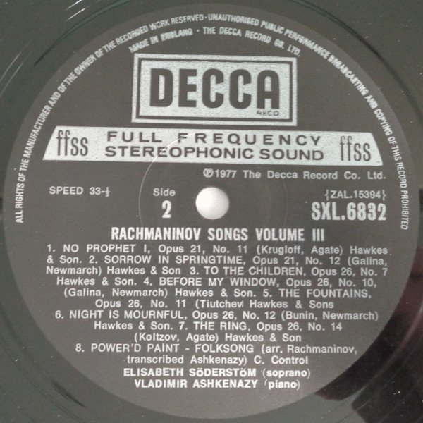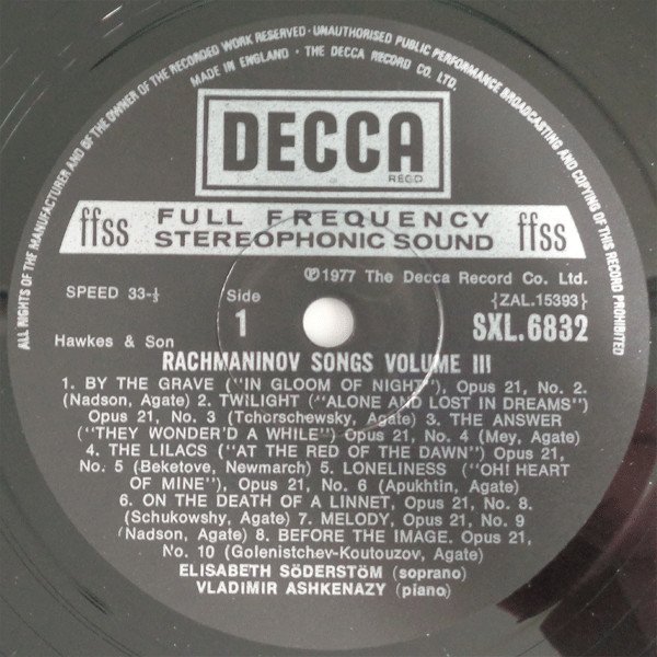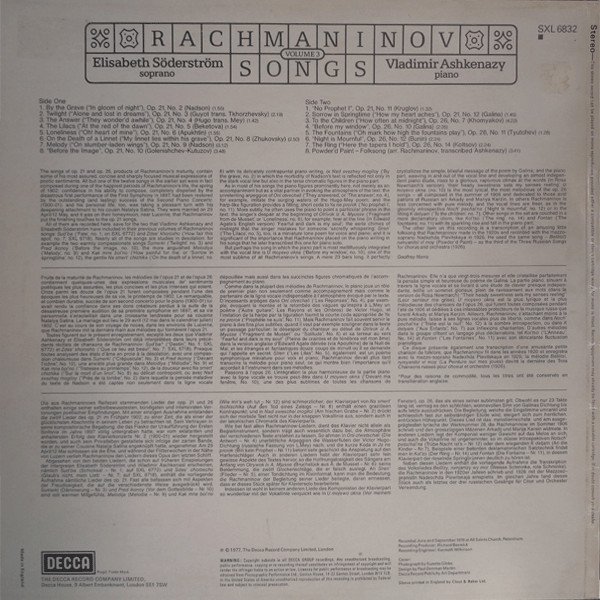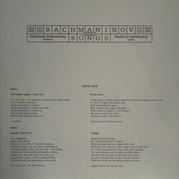 Part of Decca's 5 volume series "Rachmaninov Songs".Tracklisting taken from back of sleeve. Songs are titled in English on sleeve and labels but are sung in Russian.Includes 8-page booklet containing song texts in Russian and English