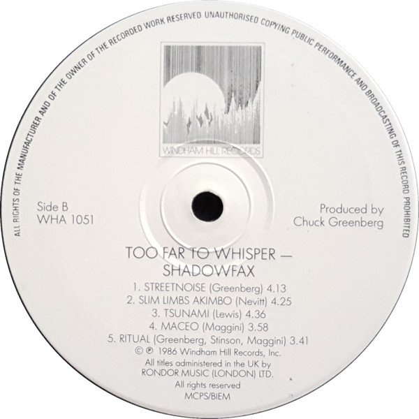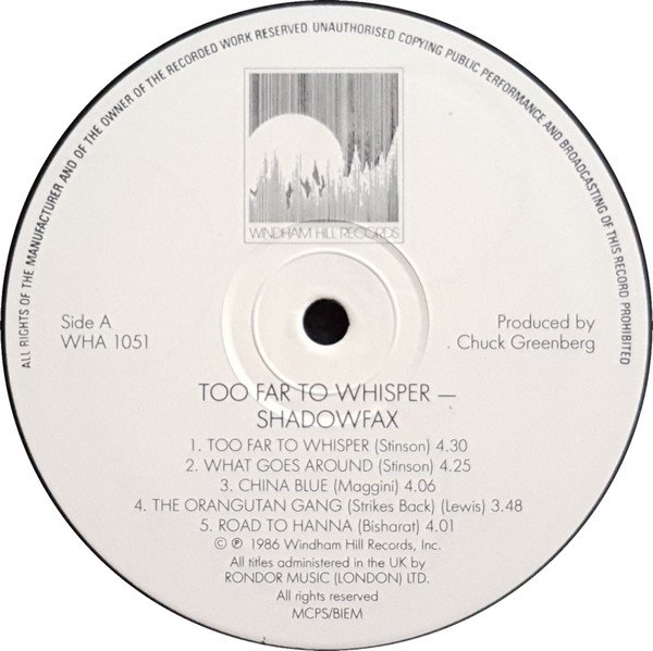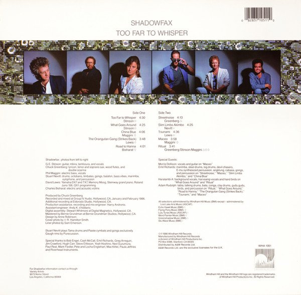 Manufactured by Windham Hill Records a division of Windham Hill Productions Inc. Recorded and mixed at Group IV Audio, Hollywood, CA, January and February 1986. Additional recording at Eldorado Studio, Hollywood, CA. [On rear cover] All selections administered by Windham Hill Music (BMI) except A4, B3 administered by Lost Lake Arts Music (ASCAP) A1, A2, B5 Echo Hawk Music (BMI) A3, B4, B5 Flying Pony Music (BMI) A4, B3 Lulu Tunes Music (ASCAP) A5 Word Painter Music (BMI) B1, B5 Greenshadow Music (BMI) B2 Stu Wave Music (BMI) A&M Records Ltd. are the exclusive licensees for the U.K. [On label] All titles administered in the UK by Rondor Music (London) Ltd. On top spine: Shadowfax Too Far To Whisper Windham Hill Records On side spine: Shadowfax Too Far To Whisper Windham Hill Records WHA 1051