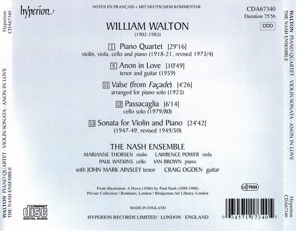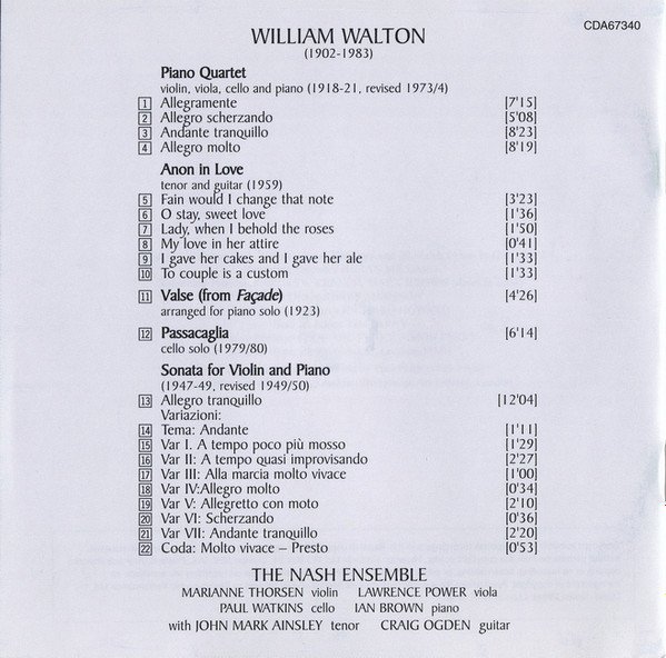 Sir William Walton - Violin Sonata / Piano Quartet / Anon In Love