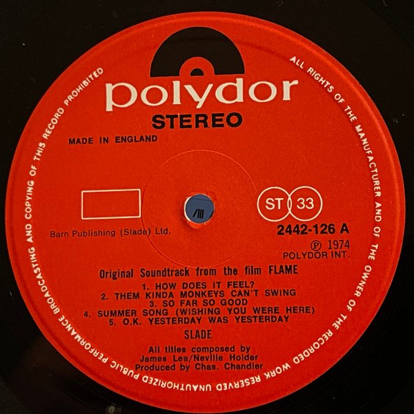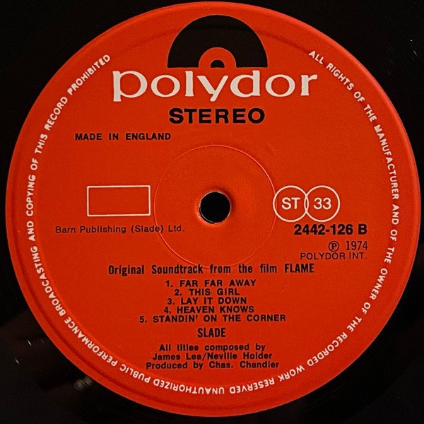 Title on sleeve: "Slade In Flame". Printed & Made By Howard Printers (Slough) Ltd. England. Runouts are stamped, except for the "Beefy" etching.
