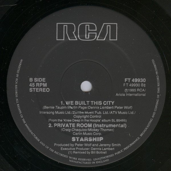 From the New Starship Album FL/FK 85488. Distributed in Europe by RCA/Ariola. Manufactured in England.
