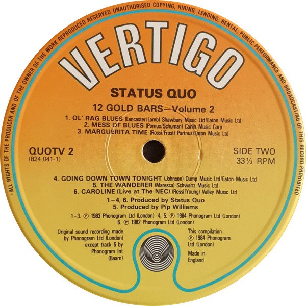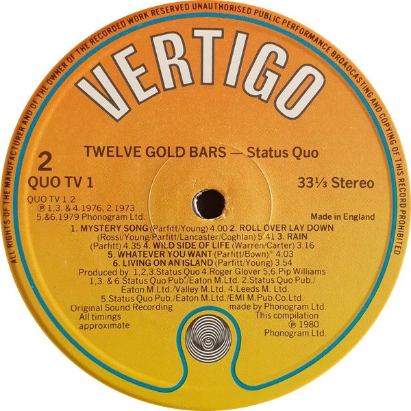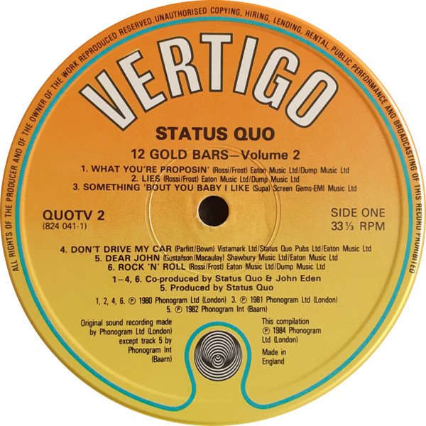 Gatefold sleeve. This compilation consists of the previously released compilations [r=512955] and [r=3298835] Album title appears on spine as '12 Gold Bars Volume Two (And One)' Disc 1 lacquer at The Town House, disc 2 lacquer cut at CTS Studios. Sides A, B & D were plated at Lyntone Recordings Ltd. Titles on center labels: 'Twelve Gold Bars' (Disc 1) '12 Gold Bars - Volume 2' (Disc 2) Center labels also show catalog numbers 'QUO TV 1' (Disc 1) and 'QUOTV 2 (824 041-1)' (Disc 2). (Approximate) track durations stated only on Disc 1. Barcode also includes 824 041-1 catalog number, QUOTV 2 is printed on the sleeve rear, VERTIGO QUOTV 2 on the spine. A4 ℗ 1972 A3, B2 ℗ 1973 A2, A5 ℗ 1974 B1, B3, B4 ℗ 1976 A1 ℗ 1977 A6 ℗ 1978 B5, B6 ℗ 1979 C1, C2, C4, C6 ℗ 1980 C3 ℗ 1981 C5, D6 ℗ 1982 D1 to D3 ℗ 1983 D4, D5 ℗ 1984 Disc 1: ℗ 1980 Phonogram Ltd. Disc 2, side 1: ℗ 1984 Phonogram Ltd. (London)/ ℗ 1982 Phonogram International (Baarn) Disc 2, side 2: ℗ 1984 Phonogram Ltd. (London) Made in England This version has a different combination of matrix/runout stampings and etchings from any of the other ones listed.