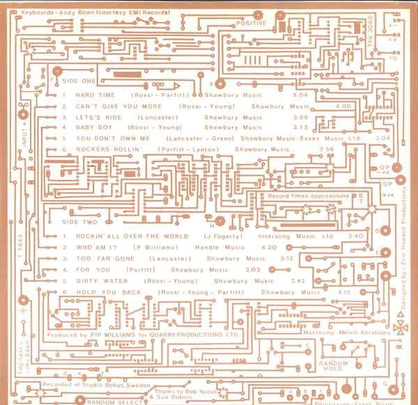 [A1- A6, B3-B6] Shawbury-Eaton Music Ltd. [A5] Essex Music. [B1] Intersong Music Ltd. [B2] Handle Music. Thanks to Bob Nolan & Sue Dubois Andy Bown appears courtesy of EMI Records. Record times are approximate. Initial copies included a printed inner sleeve.