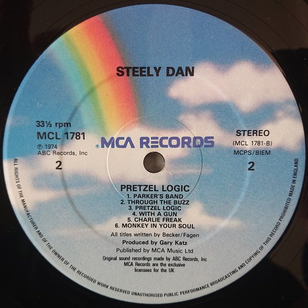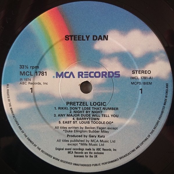This release appears to be the same as https://www.discogs.com/Steely-Dan-Pretzel-Logic/release/8731654 except that the label printing is different. 33 1/3 rpm, MCL 1781 (P)1974 ABC Records, Inc on left side of hole on 4 lines. Also STEELY DAN on top of label & PRETZEL LOGIC below hole.The Side A runout information is also different with ABCL 5015 reported on the alternative version although this could be a misreading of the data because it is heavily scratched out. It looks more like ABCL 5045 which would match the other side.All songs by Walter Becker and Donald Fagen, except "East St. Louis Toodle-Oo" by Duke Ellington and Bubber Miley. Engineered by Roger Nichols at the Village Recorder, West Los Angeles, California. Overdub and mixdown at Cherokee Sound, Chatsworth, California On label: 1974 ABC Records, Inc On sleeve: 1974 MCA Records, Inc.