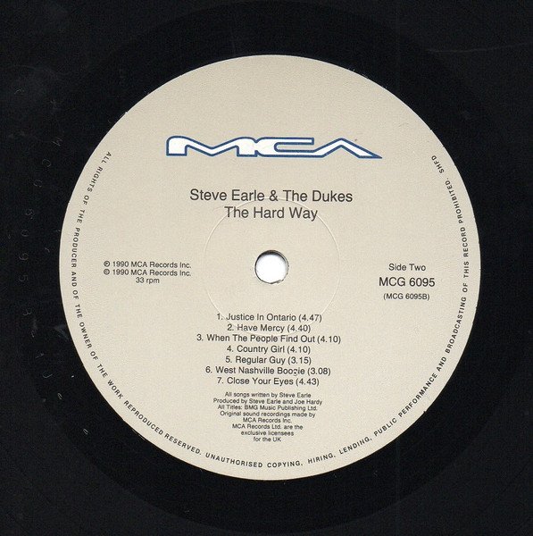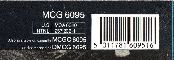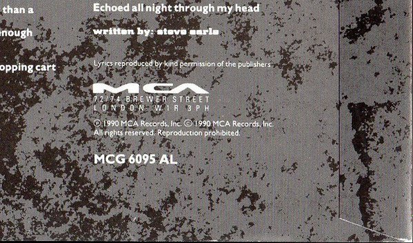 ℗ 1990 MCA Records, Inc. © 1990 MCA Records, Inc. Includes printed inner sleeve with lyrics, credits, hand written note from SE and band photo [Record labels] Original Sound recordings made by MCA Records, Inc. MCA Records Ltd. are the exclusive licensees for the UK [Publishers] All titles BMG Music Publishing Ltd. except tracks A2, A3 BMG Music Publishing Ltd. / Copyright Control [Back cover cat #'s] U.S. MCA 6340 INTNL 257 B236-1 Cassette MCGC 6095 Compact Disc DMCG 6095 [Inner Sleeve] Lyric side, lower right cat# MCG 6095 AL Note: Overdubs recording credit on the back cover is "Mark Coda" (as in general credits) and "Mark Coddington" on the inner sleeve credits.