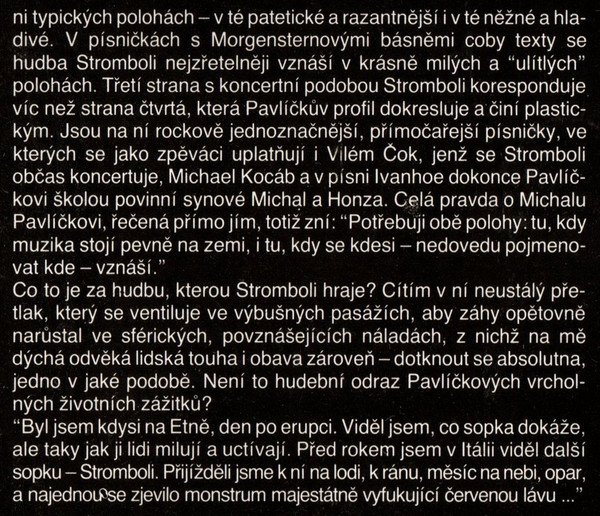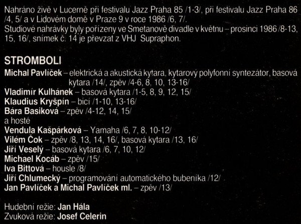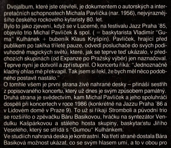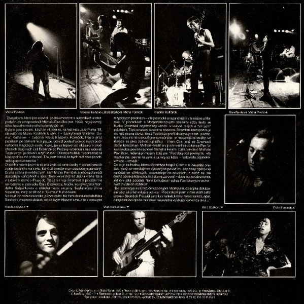 Sides A & B contains live recordings from 1985-86 Sides C & D contains studio recordings from 1986 Nahráno živě v Lucerně při festivalu Jazz Praha 85 [A1 to A3], při festivalu Jazz Praha 86 [B1, B2] a v Lidovém domě v Praze 9 v roce 1986 [B3, B4]. Studiové nahrávky byly pořízeny ve Smetanově divadle v květnu–prosinci 1986 [C1 to D1, D3, D4], snímek č. [D2] je převzat z VHJ Supraphon. Cover © 1987 Photos © 1987 Sleeve-note © 1987 Cena kompletu Kčs 88,— Made in Czechoslovakia ℗ 1987