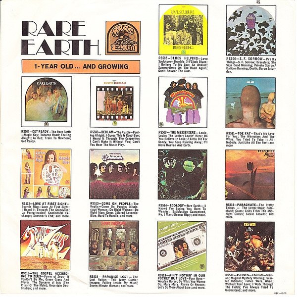 Issued in a printed company inner sleeve; some copies came in a Rare Earth sleeve and some in a Motown sleeve. Housed in a gatefold jacket. Small label variation compared to [r=3059569]. This has additional cat# on labels. Text is centered. [Gatefold inside:] ©1971 Motown Record Corporation, Detroit, Michigan 48201, all rights reserved [...] Printed in U.S.A. [Child Of Mine] *©Copyright 1970 by Screen Gems-Columbia Music, Inc. All other selections: Copyright © 1971 Jobete Music Company, Inc. [Rear sleeve:] Produced for and dedicated to Kahlil Gibran, Arthur C. Clarke, Herman Hesse, Johnny Carson, Pieter Bruegel, Stanley Kubrick, Fiorello LaGuardia, - not to mention, Jesus Christ. [Labels:] A Trademark of Motown Record Corp. © 1971