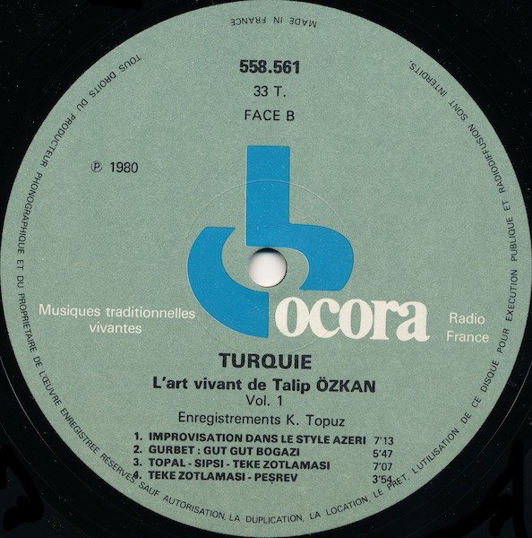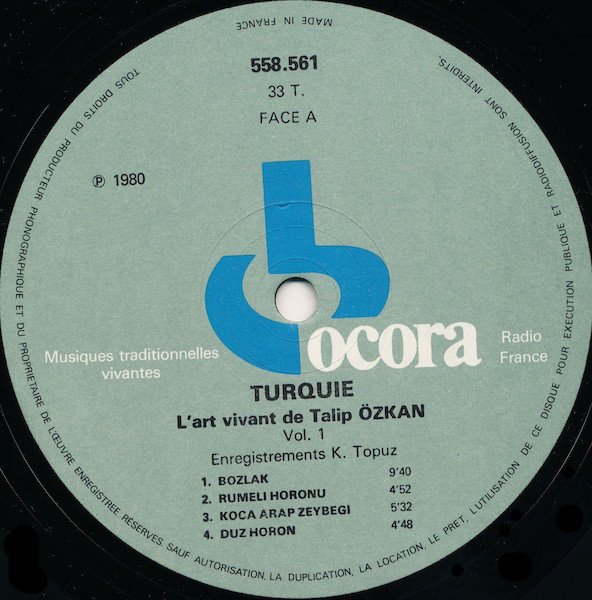 Appears in the Ocora Series "Musiques Traditionnelles Vivantes; V. Musiques Populaires." Originally produced 1980 (per label) ℗ re-edition June 1989, Paris. The cover shows an ancient miniature Menazilnamé (Le livre de route) - Matrak-Dji, first half of the 16th Century.