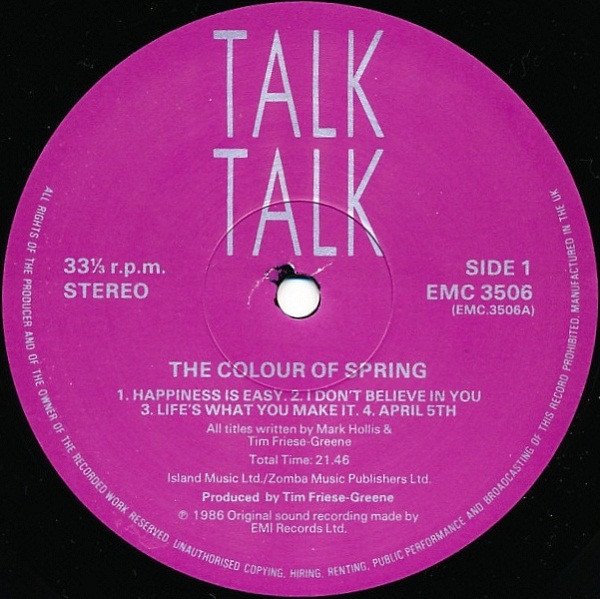Front sleeve is embossed so that the central image with butterflies is slightly raised in comparison to the rest of the cover (surrounding frame). On back cover: EMI [LP logo] EMC 3506. [Cassette logo] TC EMC 3506 24 04911 (P) 1986 Original sound recordings made by EMI Records Ltd. (C) 1986 EMI Records Ltd. AD 8602 JU. On one side of the inner sleeve are credits, and following printed: EMC 3506 Discography: The Party's Over '82 • It's My Life '84 • For Information Write To: Talk Talk, BSM Talk Talk • London WC1N 3XX On the other side of the inner sleeve are Mark Hollis' handwritten lyrics, and at the bottom following printed: Lyrics reproduced by kind permission of Island Music Ltd. / Zomba Music Publ. Ltd. On labels: (Side A) Total time: 21.46 (Side B) Total time 24.05 (Publishers) Island Music Ltd. / Zomba Music Publishers Ltd. Manufactured in the UK. All matrix details are stamped with exception of 'Lacquer cut' mark by NICKZ which is etched.