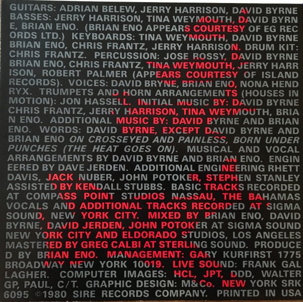 Basic tracks recorded at Compass Point Studios, Nassau, The Bahamas. Vocals & additional tracks recorded at Sigma Sound, NYC. Color inner sleeve with credits and photo Black & white lyric sheet This was pressed by [l314605] and has Warners' Burbank address in the label rim. [r=116491] was pressed by [l313656] and omits that address.
