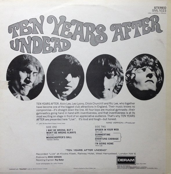 Label layout without JT credits on the bottom (released right after the one including JT). "Ten Years After Undead" Recorded "Live" at Klooks Kleek, Railway Hotel, West Hampstead, London NW 6. On the label the writer's credits for A1 go to the whole band. Tracks B2 and B3 are not separated on the disc. Released on a red and white Deram label with black print in a sleeve laminated on the front only. Also released in mono (# DML 1023). Some copies come with a ''Isle of Wight'' sticker.