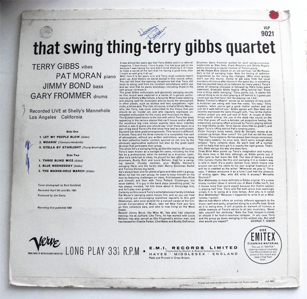 Recorded live at Shelley's Mannhole, Los Angeles, Calif. Cover Photograph by Burt Goldblatt. Recorded April 5 & 8, 1961. Advertised as part of "New E.M.I. jazz releases for March" on page 6 in the 28th February 1963 issue of "Jazz News & Review" magazine.