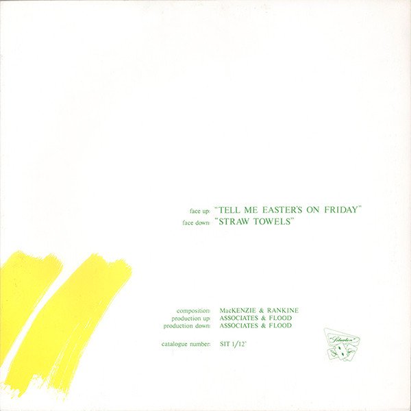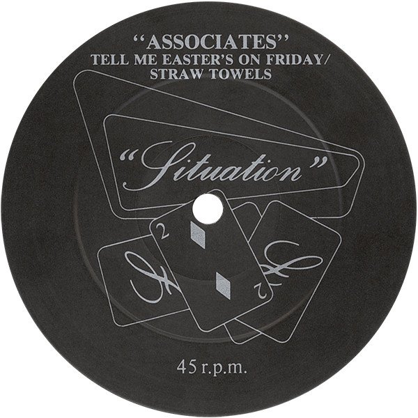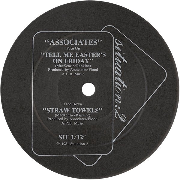 A-Side: Label with credits and "Face Up" / Face Down". B-Side: Label with title, Situation 2 logo and "45 r.p.m.". (labels are vice versa on the [url=/Associates-Tell-Me-Easters-On-Friday/release/698416]7"[/url]). Track A is a slightly mixed and re-edited version of the [url=/Associates-Tell-Me-Easters-On-Friday/release/698416]7"[/url] and track B has an alternate start and end. Durations not mentioned on the release.
