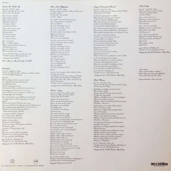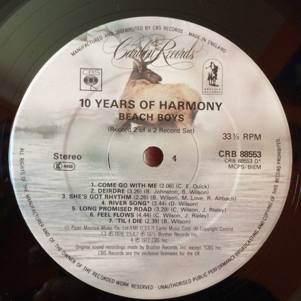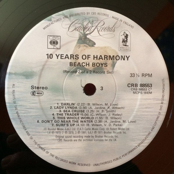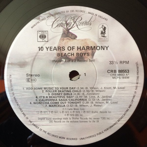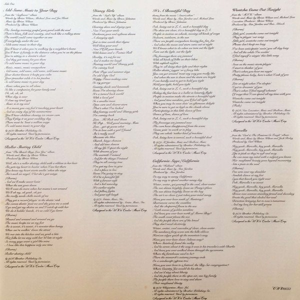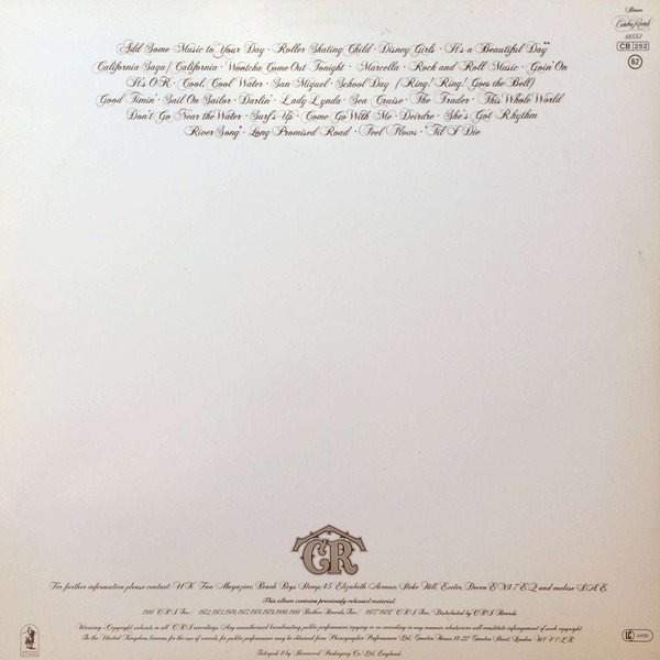 © 1981 CBS Inc. / ℗ 1972, 1973, 1976, 1977, 1979, 1980, 1981 Brother Records Inc. / ℗ 1977*, 1979** CBS Inc. / Manufactured and distributed by CBS Records / Made In England With lyric booklet * D4, ** A4 Contains single edits/mixes of the following songs: It's A Beautiful Day California Saga/California Rock And Roll Music Cool, Cool Water School Day (Ring! Ring! Goes The Bell) Additional info: Sea Cruise - outtake from 1976 It's A Beautiful Day - recorded for "Americathon" movie Darlin' - from the live album "In Concert" Runouts are etched, except additional stamped letter/ciffer (A = Λ and ∴)