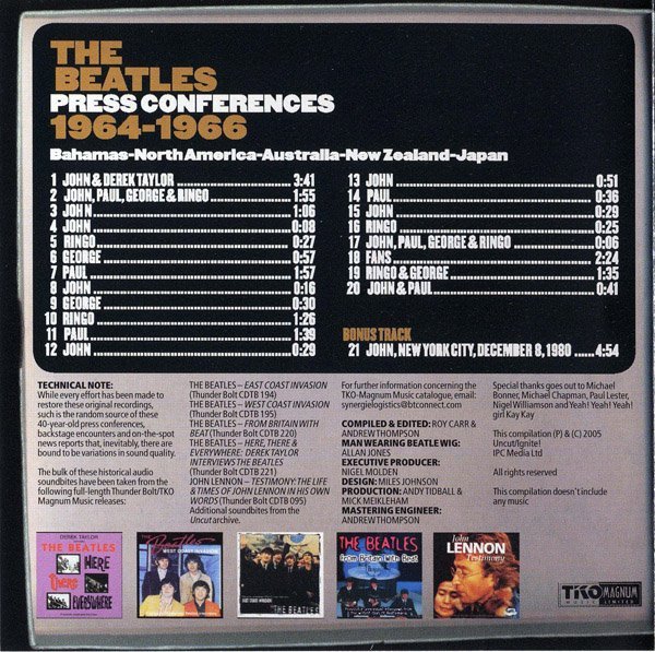 Bahamas-North America-Australia-New Zealand-Japan Free covermount CD with the October 2005 issue of Uncut magazine, issued September 2005. Technical Note: While every effort has been made to restore these original recordings, such is the random source of these 40-year-old press conferences, backstage encounters and on-the-spot news reports that, inevitably, there are bound to be variations in sound quality. The bulk of these historical audio soundbites have been taken from the following full-length Thunder Bolt/TKO Magnum Music releases: The Beatles - "East Coast Invasion" (Thunder Bolt CDTB 194). The Beatles - "West Coast Invasion" (Thunder Bolt CDTB 195). [r7629287] (Thunder Bolt CDTB 220). [r7628534] (Thunder Bolt CDTB 221). [r2518829] (Thunder Bolt CDTB 095). Additional soundbites from the Uncut archive. This compilation ℗ & © 2005 Uncut/Ignite! IPC Media Ltd. This compilation doesn't include any music.