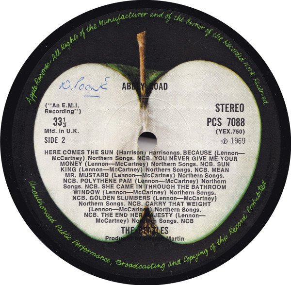 Same as [r549808] but with a small ℗ on the labels and on the front cover the drain is visible in the crossing. Could be the first version with the Her Majesty credit on Side B label. Track is credited as "The End Her Majesty". Laminated sleeve. "An E.M.I. Recording" Mfd. in U.K. Thanks to George Martin, Geoff Emerick and Phillip McDonald Northern Songs. NCB. - A1, A3, A4, A6, B2 to B11 Harrisongs - A2, B1 Startling Music - A5 Printed by Garrod & Lofthouse International Ltd