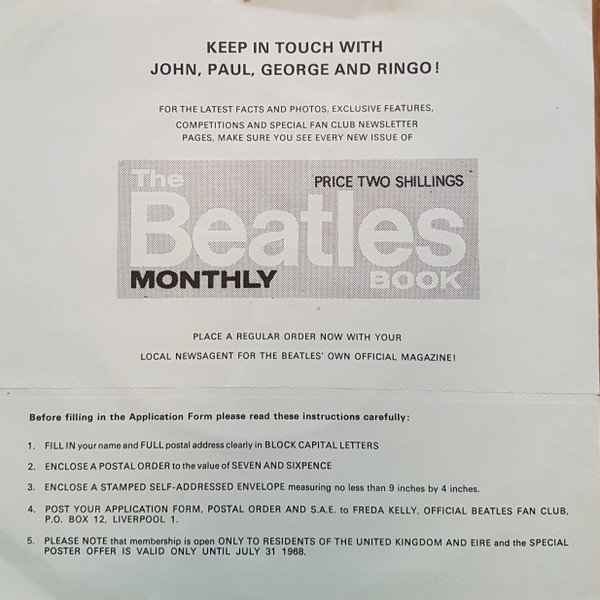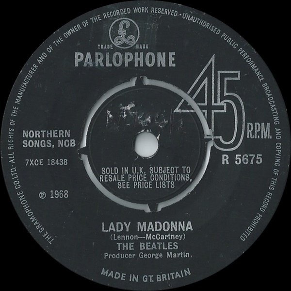 Please note the main differentiator between this, original pressing, and a slightly later 1969 pressing, is the presence of the centre label text, Embossed on centre label B side on variant 3 'SOLD IN U.K. SUBJECT TO RESALE PRICE CONDITIONS SEE PRICE LISTS' Initial pressings came with a two-sided flyer promoting the 'Official Beatles Fan Club' on one side and the monthly magazine 'The Beatles Book' on the other. New members joining the fan club received a giant colour poster of the group taken during the singles recording session. There is also a contemporaneous version with a [url=https://www.discogs.com/The-Beatles-Lady-Madonna/release/1443267]solid centre[/url]. Made in Gt. Britain.