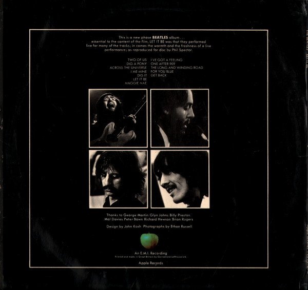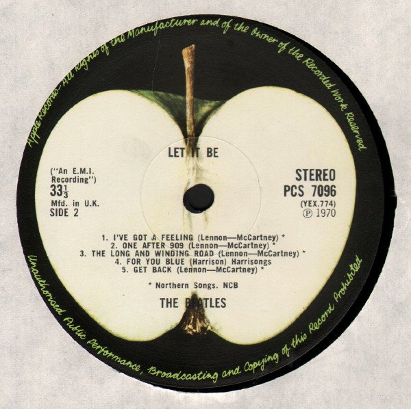 Issued in a fully laminated sleeve with green Apple logo on back cover. Track timings do not appear on the release. Some copies came with a "Parlophone Not For Resale" sticker at front cover (shown at the data base pictures) An E.M.I. Recording. Printed and made in Great Britain by Garrod & Lofthouse Ltd. ℗ 1970 All selections: Northern Songs, NCB except A4, B4: Harrisongs. A5, A7: Northern Songs, NCB. Startling Music. Harrisongs. Runouts are stamped.