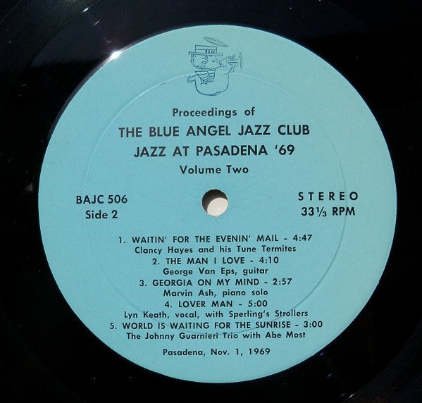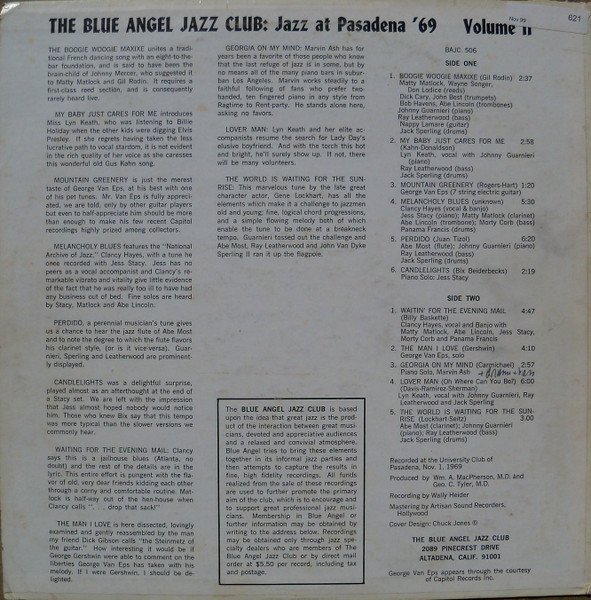 Private pressing LP available to members of The Blue Angel Jazz Club. Recorded at the University Club, Pasadena, California November 1, 1969 George Van Eps appears courtesy of Capitol Records Inc.