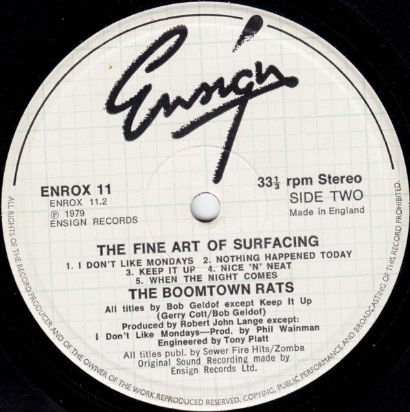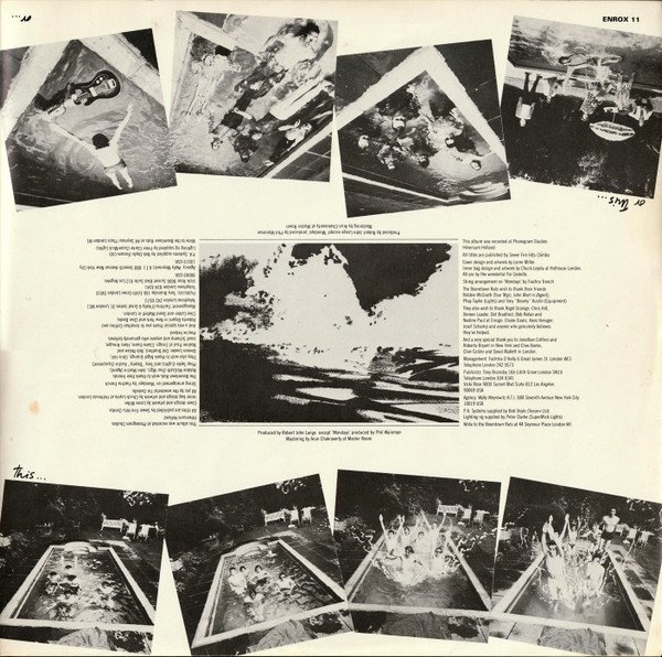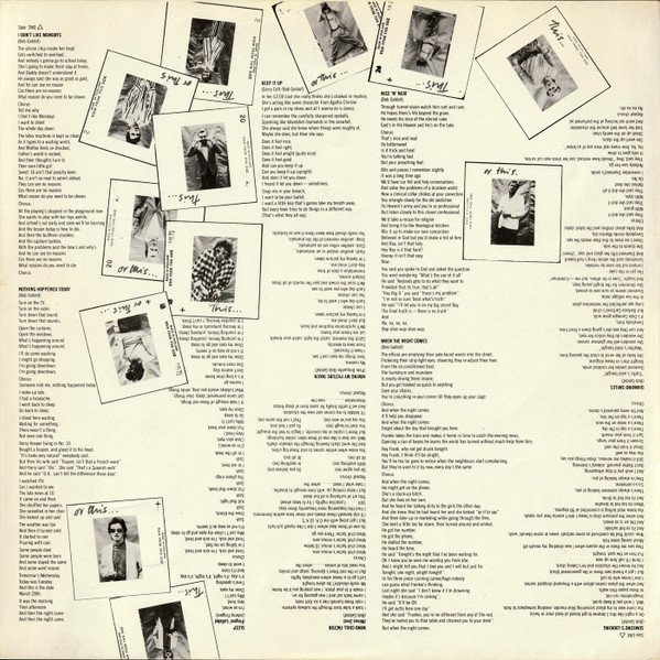 Printed inner sleeve includes credits, lyrics and photographs. ℗ 1979 Ensign Records. Made in England. Printed in England. Track A1 titled "Someone's Looking" on the inner sleeve. Runout stamped with etched ARUN (Side A) & RON PETERS LIVES or "RON PETERS LIVES" or RON PETER LIVES (Side B). Runout on Side A contains audio throughout and a locked groove, repeating a shout/scream at the end. Durations do not appear on this release. Timings via stopwatch.
