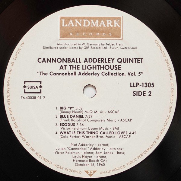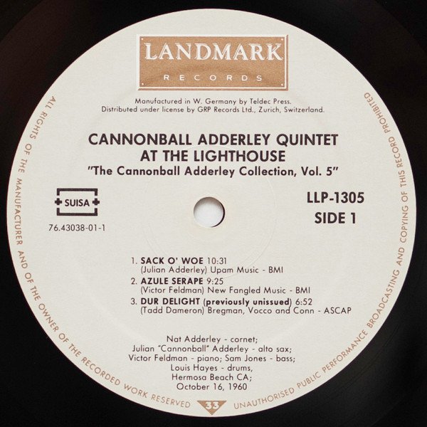 Recorded At The Lighthouse, Hermosa Beach, California, October 16, 1960 Digital Rerecording at Fantasy Studios, Berkeley, CA, 1986 Digital mastering at Fantasy Studios, 1986 Distributed under license by GRP Records Ltd Zurich Switzerland Originally issued in 1960 as "The Cannonball Adderley Quintet: At The Lighthouse" on Riverside 9344 (stereo) and 344 (mono). Never previously reissued. (P)&(C) 1986 Landmark Records Publishers: - A1, B3: Upham Music - BMI - A2: New Fangled Music - BMI - A3: Bregman, Vocco and Conn - ASCAP - B1: MJQ Music - BMI - B2: Composers Music - ASCAP - B4: Warner Bros. Music - ASCAP Runout info is stamped, except "A-B-I" etched.