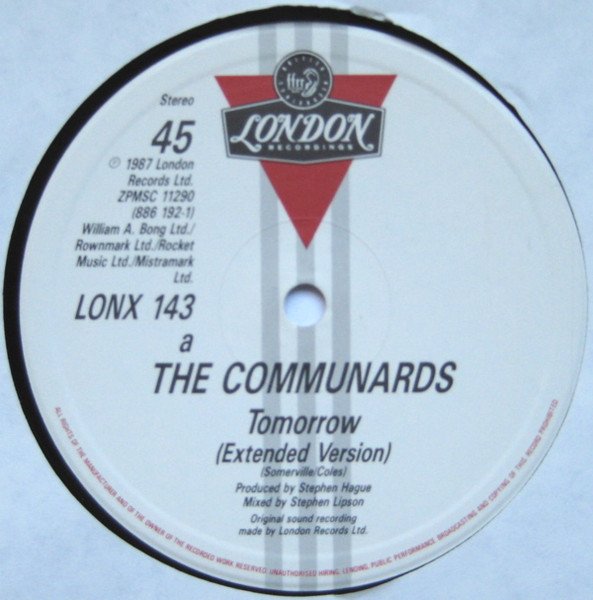 'Tomorrow' taken from the forthcoming LP/CD/Cassette [url=http://www.discogs.com/Communards-Red/master/49635]'Red'[/url].Side A recorded at Advision, London. Side B recorded at Milo Music, London.℗ 1987 London Records Ltd. Track A & B1: William A. Bong Ltd./Rownmark Ltd./Rocket Music Ltd./Mistramark Ltd. Track B2: Rocket Music Ltd./Mistramark Ltd. Track B3: William A. Bong Ltd./Rownmark Ltd. Original sound recording made by London Records Ltd.Track times do not appear on release. 2nd cat# appears only in brackets on center labels.