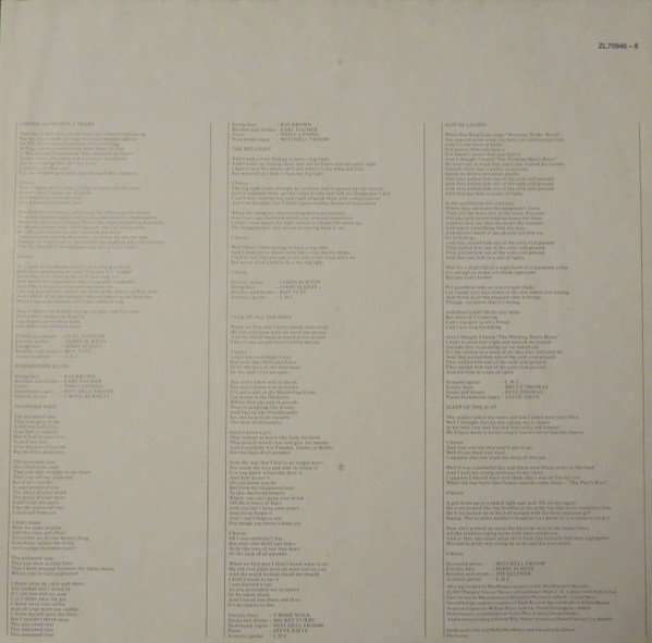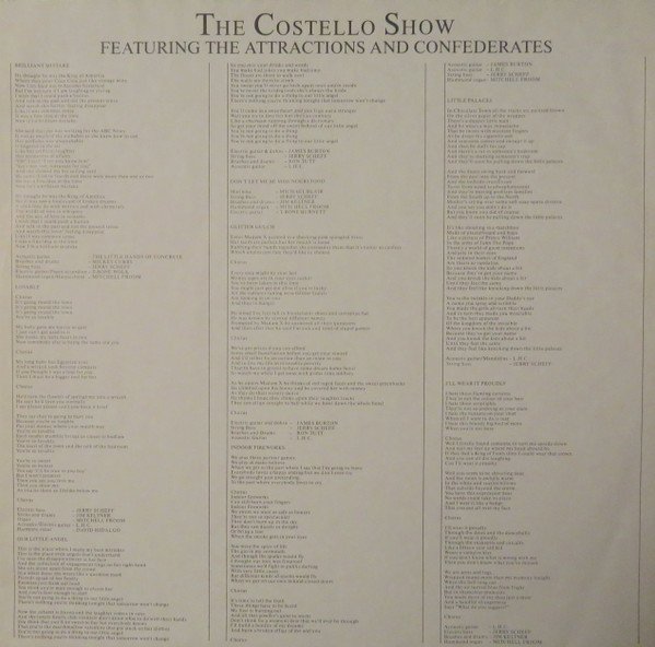 Manufactured without the Sonopress bass clef on side B, very similar to [r=23141327] with the bass clef. Performances recorded live at Ocean Way & Sunset Sound Studio Additional recording at Ocean Way, Sunset Sound and Sound Factory Los Angeles Printed inner sleeve with lyrics Labels are white with black letters Back cover: (LP) ZL70946 (Cassette) ZK70946 (CD) ZD70946 ℗1986 Riviera Global Record Productions Ltd. Sleeve ©1986 F. Beat Records Ltd. Distributed in Europe by RCA/Ariola Distribue en Europ par RCA/Ariola Vertrieb in Europa durch Ariola/RCA Printed in West Germany : Imprimé en Allemagne Made in W. Germany - Fabriqué en Allemagne A/B side runout groove: Precision SF Label cat# are "ZL 70946" on spine and "ZL70946" elsewhere Publishers on labels: All titles except A4 and B2: Plangent Visions Music Ltd. A4: Carlin Music Corp. B2: Copyright Control Publishers on inner sleeve: All songs except A4 and B2: ℗ 1985 Plangent Visions Music Ltd A4: Carlin Music B2: Jewel Pub Co Ltd Some copies issued with hype sticker: "King Of America The New Album From Elvis Costello Play Loud This Sticker Is Removable ZL70946" The runouts are etched; except of the stamped B-4166 A-1 and B-4166 B-1.