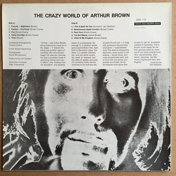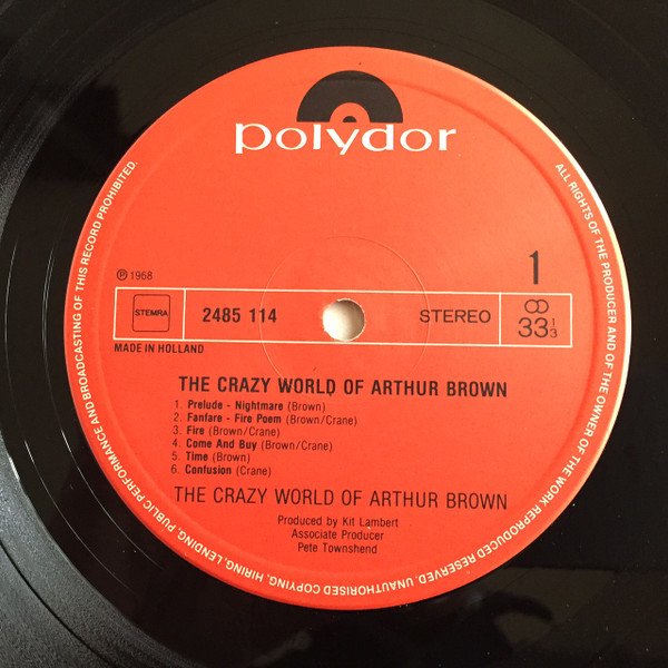——Sleeve info—— Printed in Holland — liner notes in English spine: The Crazy World Of Arthur Brown 2485 114 Stereo ——Center labels info—— ℗ 1968 Made In Holland ——Extra info—— Track A6, „Confusion”, is not listed on the tracklisting on the cover, but only on the center labels. Version without embossed 'PRS BAARN'