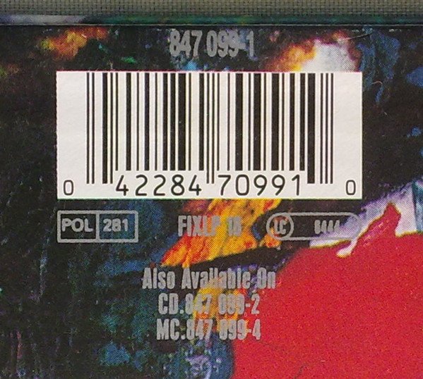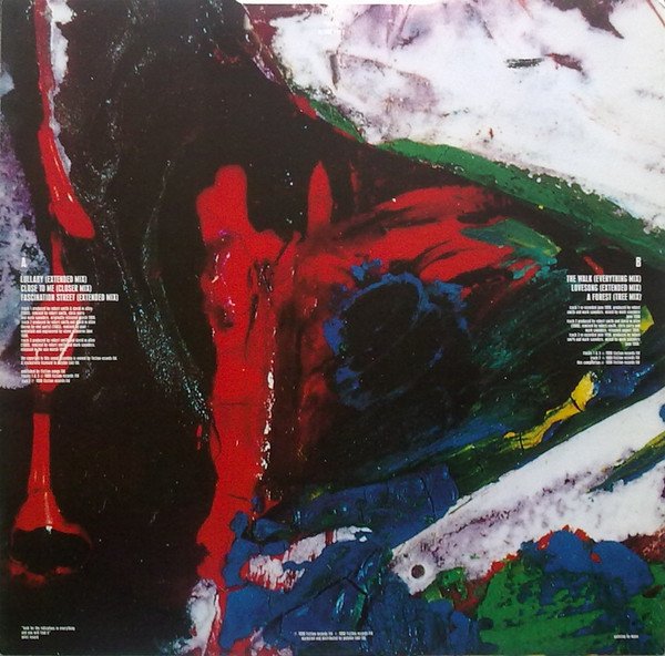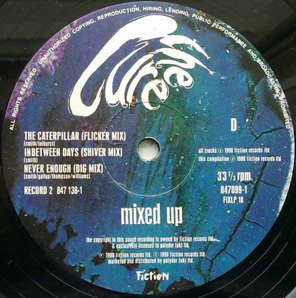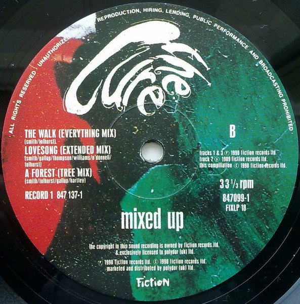 Issued in a matte card picture sleeve, text printed silver; individually printed inners and custom picture labels with text in white. Some copies have a round silver sticker on front sleeve stating: "The Cure Mixed Up includes [m=31962] [url=http://www.discogs.com/Cure-Close-To-Me-Remix/master/31934]Close To Me[/url] remixes 847 099-1" Also released on CD. [url=https://www.discogs.com/release/4849234]847 099-2[/url] MC. [url=https://www.discogs.com/release/581383]847 099-4[/url] ℗ 1990 Fiction Records Ltd. © 1990 Fiction Records Ltd. Marketed and distributed by Polydor (UK) Ltd. [Record 1 inner sleeve, bottom left] "Look for the ridiculous in everything and you will find it! [a1464894]" [Record 2 inner sleeve, bottom left] "Thanks to: everyone at fiction and everyone and anyone else who helped with all this!!!" B3 "A Forest" and B1 "The Walk" were not remixed from the original tapes (lost) but from re-recordings. Pressing credit derived from run-out area matrix.