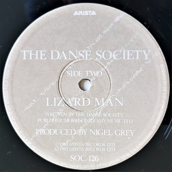 ℗ 1983 Arista Records Ltd © 1983 Arista Records Ltd. A Society Records product through Arista. Recorded October 1983. On the label, Nigel Gray is credited as Nigel Grey. Although uncredited, track A is the extended version, title is adjusted. Durations are not printed on the release Runout info: variant 2. stamped except etched BilBo. TAPE One