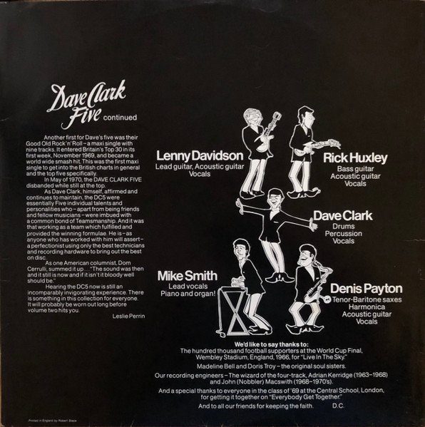 Housed in a fully laminated jacket. Issued with a printed cardboard inner sleeve including band history and credits. Title on rear jacket: Twenty-five Thumping Great Hits All tracks are Mono, except tracks B1, B3, B5 and B7 to B9. Month of release information from Record Collector Magazine June 1993 p.123 Runout matrix stamped and 'lyre' symbol etched. Phonographic copyright years: A1, A2: â„— 1963 A3, A4, A6: â„— 1964 A5, A7, A8, B2, B6: â„— 1965 A9, A10: â„— 1967 B4, B5: â„— 1968 B1, B9, B10: â„— 1969 B3: â„— 1970 B7, B8: â„— 1973 Song publishers: A1, A5, A6: Ivy M.Ltd. A2: Dominion M.Ltd. A3, A4: Ardmore & Beechwood Ltd. A7: Burlington M.Ltd. A8: Jewel M.Pub.Co.Ltd. A9: Leeds M.Ltd. A10: Donna M.Ltd. B1a: A. Schroeder M.Pub.Co. B1b: Jewel M.Pub.Co. B1c: Cop.Con. B1d: Sou'rn M.Pub.Co. B1e: Rob't Mellin M. B1f: Car'n M. B2, B4: SpursM. B3: Mills M. B5: Chappell-Morris B6: Ivy M. B7: Screen Gems-EMI M. B8, B9: United Artists M. B10: Essex M.Int. [Rear jacket:] All tracks on this album were recorded at Lansdowne Recording Studios, London, England This album is dedicated to Sir Edwin and Lady C. A Dave Clark Production Printed in England by Clout & Baker Ltd. [Inner sleeve:] Printed in England by Robert Stace [Labels:] Made in England This compilation â„— 1978 Dave Clark