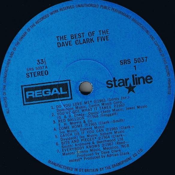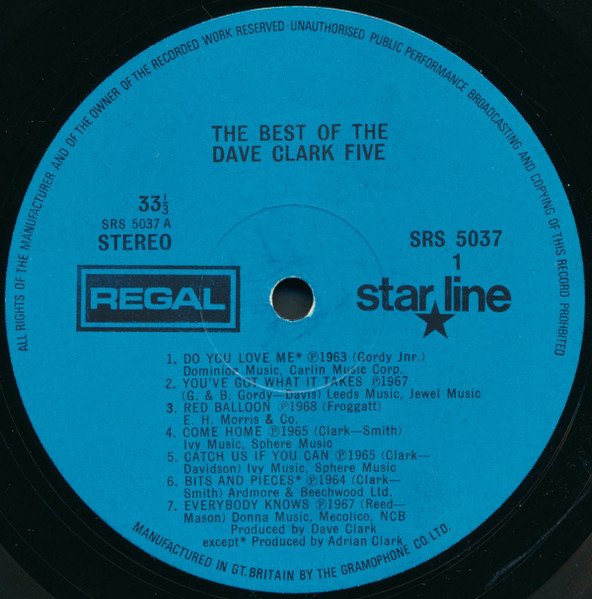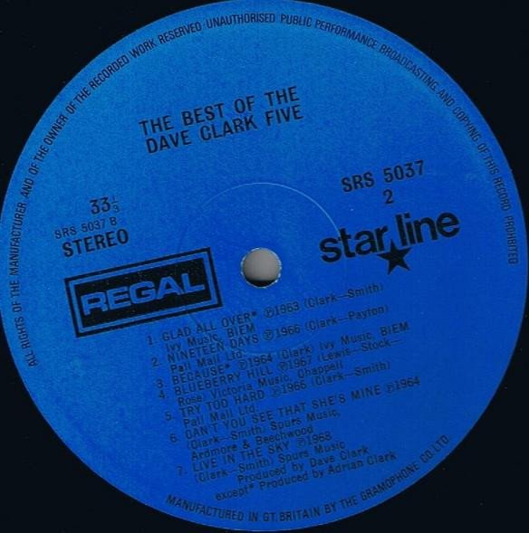 Issued in a front-laminated sleeve with flipbacks at rear with text stating: 'File under Popular Pop Groups' at the top; '7010 TPS Printed and made by Garrod & Lofthouse Ltd. Patent No. 943,835 SRS 5037' at the bottom. Label rim text reads: Manufactured By The Gramophone Co. Ltd. All tracks in true stereo. In 1963 a new name, a knock out song and a pop legend was born - The Dave Clark Five and 'Glad All Over'. This legend is still topping the charts all over the world and this LP contains 14 of Dave's biggest hits covering the period 1963 to 1968. Not only does Dave perform and produce his hit songs, but also writes most of them, a true phenomena in this mad pop world where one month an artist tops the charts and the next he is forgotten. Dave's success was also projected in the box-office smash film - 'Catch Us If You Can'; this alone is good enough reason for the inclusion of this title on this album. The tracks in this collection represent over 14 million world sales and are a must for every Dave Clark fan or just anyone who appreciates good music. - Mort Lindford