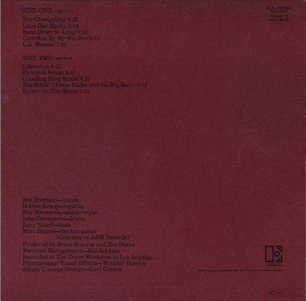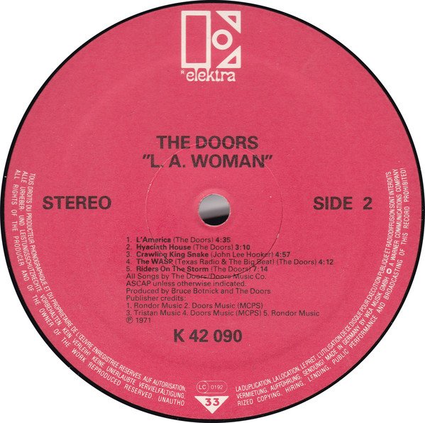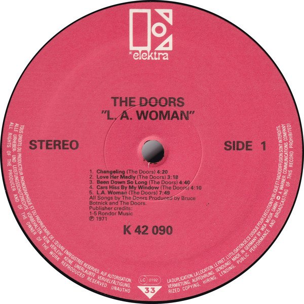 Record label has different track layout and credits to similar releases. Rights society GEMA is not printed on label of this release. Cat# does not have additional numbers in brackets underneath as seen on similar releases. Side A Label - printed under track list: All Songs by The Doors Produced by Bruce Botnick and The Doors. Publisher credits: tracks 1 - 5 Rondor Music. Side B Label - printed under track list: All songs by The Doors / Doors Music Co. ASCAP unless otherwise indicated. Produced by Bruce Botnick and The Doors. Publisher credits: 1. Rondor Music 2.Doors Music (MCPS) 3. Tristan Music (MCPS) 5. Rondor Music. First cat# on label. Front and back cover top right hand corner has cat number ELK 42 090 and (EKS 75011) printed underneath. Price code Germany Z (Z is circled) France: WE 341 is also printed below cat log numbers. Back cover bottom left hand corner ELEKTRA & Logo. Printed below logo: Made in Germany by WEA Musik GmbH. A Warner Communications Company. LC 0192 Printed on top of W (Warner embossed logo). Spine has 42090 (EKS 75011) DOORS L.A WOMAN STEREO printed on it. Plain white sleeve.