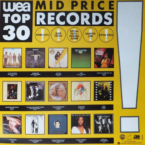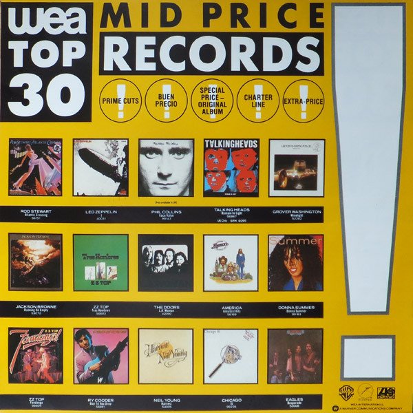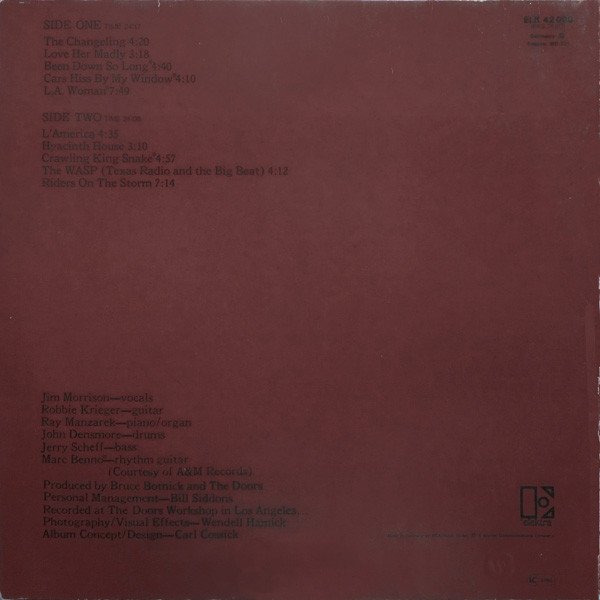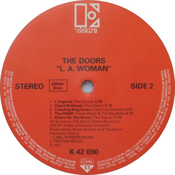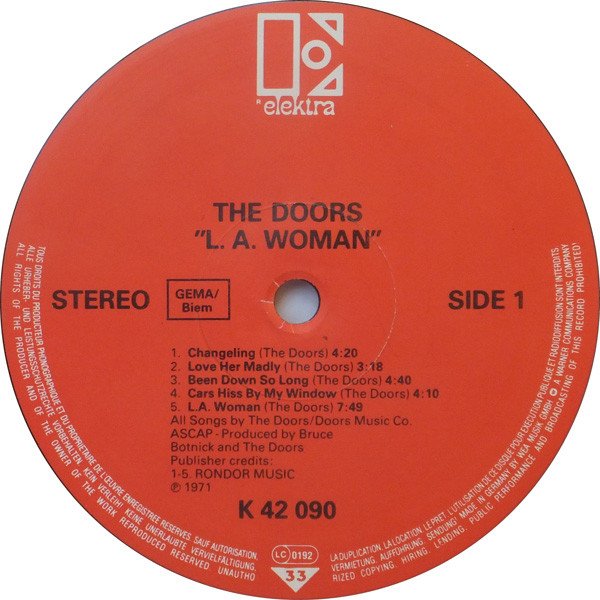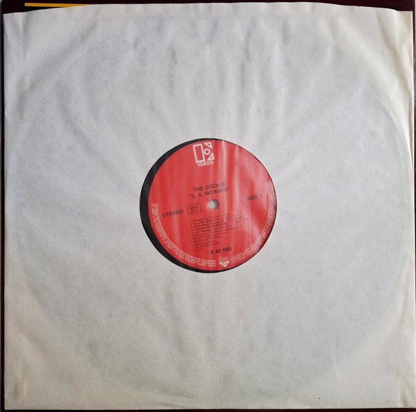 Reissue within the WEA Top 30 mid price series. Red Elektra center labels, European distribution. Released with removable yellow exclamation mark sticker and 'WEA Top 30' inlay sheet. Featuring a white polylined paper inner sleeve with one hole, two cut corners on top, and numbers on bottom right corner ("N 3/5/4"= 1984, which is the inner sleeve mfd. year date and may slightly vary from copy to copy). Catalogue numbers: Sleeve: ELK 42 090 (EKS 75 011) Spine: 42 090 (EKS 75 011) Label: K 42 090 Recorded at The Doors Workshop in Los Angeles... All songs published by Rondor Music except B3 published by Tristan Music. ℗ 1971 Made in Germany The previous red label GEMA edition with price code 'Germany: Ⓩ' on the sleeve rear can be found [url=http://www.discogs.com/Doors-LA-Woman/release/1716704]here[/url]. The subsequent GEMA/Biem edition with Barcode can be found [url=http://www.discogs.com/Doors-LA-Woman/release/3980586]here[/url]. Runouts are stamped from beginning up to the side identifier and the subsequent stamper number; the rest is etched.
