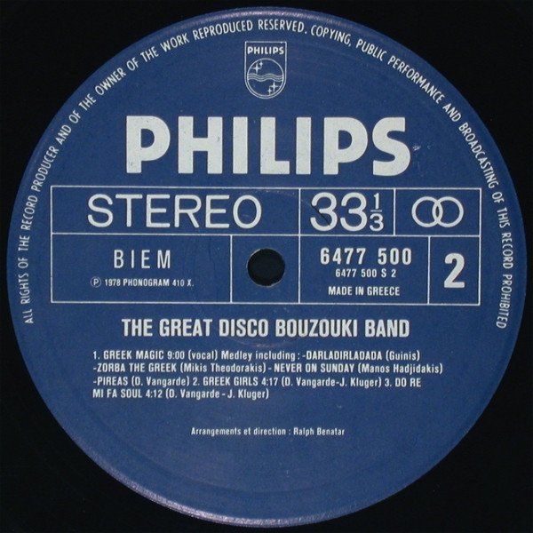 On cover: "Including: Giorgio - Greek Magic - Disco Bouzouki" Editions: Zagora / Bleu Blanc Rouge. Recto: Photo Pictor/Aarons. M/C 7135 200 ℗ 1978 Phonogram 410 X. Made in Greece [labels]