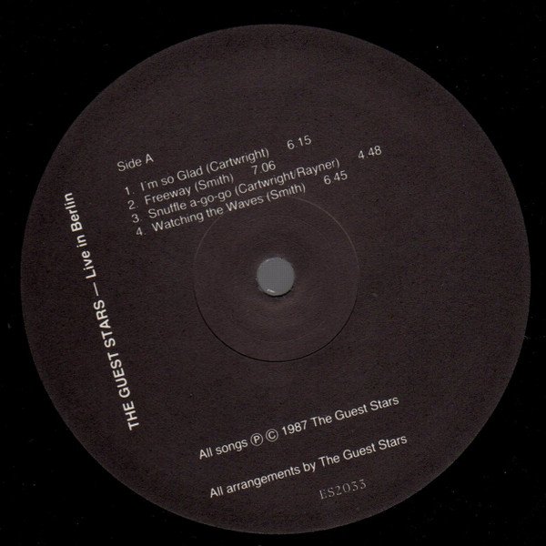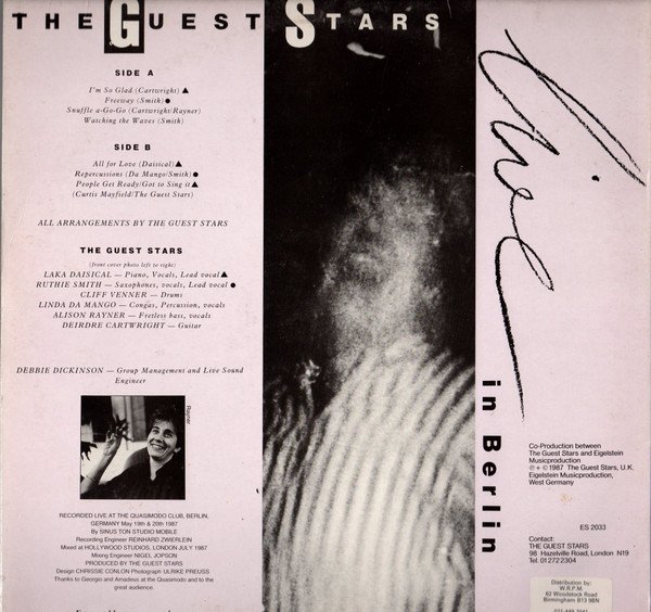 From rear sleeve: Co-Production between The Guest Stars and Eigelstein Musicproduction ℗ + © 1987 The Guest Stars, U.K. Eigelstein Musicproduction, West Germany Recorded live at the Quasimodo Club, Berlin, Germany May 19th & 20th 1987 by Sinus Ton Studio Mobile. Mixed at Hollywood Studios, London July 1987. From labels: All songs ℗ © 1987 The Guest Stars except People Get Ready © Warner Brothers