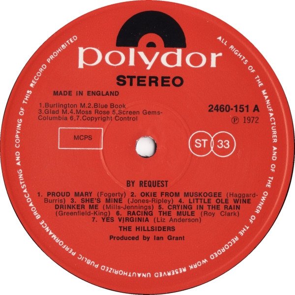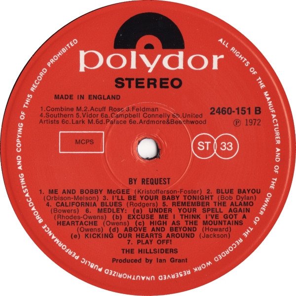Printed in England. ℗ 1972 ----- Moonshine Company Logo in top right corner Music Publishers Tracks A1 - Burlington M. A2 - Blue Book A3 - Glad M. A4 - Moss Rose A5 - Screen Gems - Columbia A6 - Copyright Control A7 - Copyright Control Tracks B1 - Combine M. B2 - Acuff Rose B3 - Feldman B4 - Southern B5 - Vidor B6a - Campbell Connelly B6b - United Artists B6c - Lark M. B6d - Palace B6e - Ardmore & Beechwood