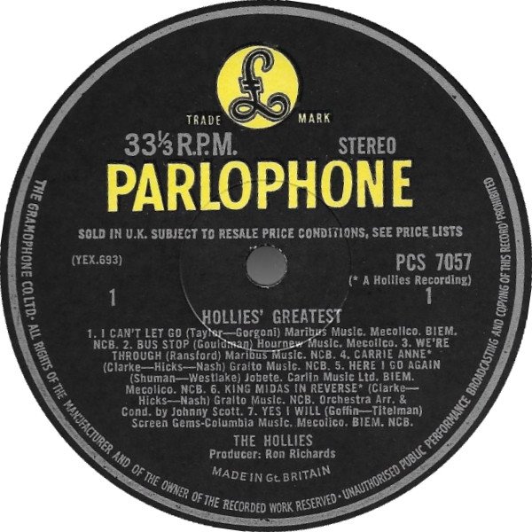 First pressings: Front laminated 3-flipback cover printed and made by Garrod & Lofthouse Ltd. Yellow & black Parlophone labels.Label variation of [r18888193]: different publisher (A5) and rights society (B4).The version of "Yes I Will" that appears on the stereo version of this album is not the 1965 hit single version, but an earlier and previously unreleased recording from 1964 – the result of an administrative error at EMI which was not noticed until after the album had been released.[Publishers / rights societies:] A1 · Maribus Music. Mecolico. BIEM. NCB. A2 · Hournew Music. Mecolico. A3 · Maribus Music. NCB. A4 · Gralto Music. NCB. A5 · Jobete. Carlin Music Ltd. BIEM. Mecolico. NCB. A6 · Gralto Music. NCB. A7 · Screen Gems-Columbia Music. Mecolico. BIEM. NCB. B1 · S. Bernstein Ltd. Mecolico. BIEM. NCB. B2 · T. S. Music. Marquis Music. Mecolico. NCB. B3 · Gralto Music. NCB. B4 · Lorna Music. BIEM. NCB. B5 · Manchester Music. F. Day. B6 · Gralto Music. NCB. B7 · Gralto Music. NCB.Made in Gt. Britain