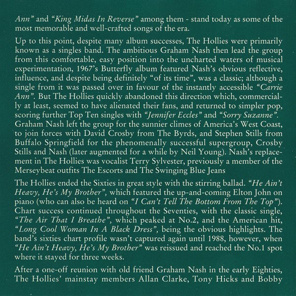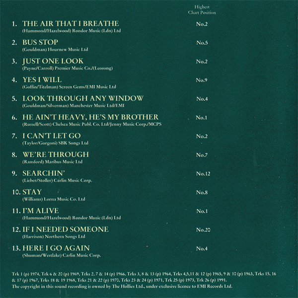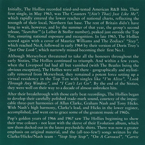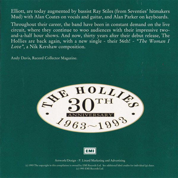 Issued in a jewel case with 8-panel foldout insert. A logo featuring 'The Hollies 30th Anniversary 1963-1993' is printed on the back cover and insert. Publishers: Trks 1, 11 Rondor Music (Ldn) Ltd Trk 2 Hournew Music Ltd Trk 3 Premier Music Co./(Leosong) Trk 4 Screen Gems/EMI Music Ltd Trk 5 Manchester Music Ltd/EMI Trk 6 Chelsea Music Publ. Co. Ltd/Jenny Music Corp./MCPS Trk 7 SBK Songs Ltd Trk 8 Maribus Music Ltd Trks 9, 13 Carlin Music Corp. Trk 10 Lorna Music Co. Ltd Trk 12 Northern Songs Ltd Trks 14 to 16, 18 Gralto Music Ltd Trk 17 Dick James Music, Inc. Trk 19 EMI Music Publishing Ltd Trk 20 ATV Music Ltd/Interworld Music Ltd/BMG Music Trk 21 Abacus Music Ltd (Carlin) Trk 22 Dick James Music Ltd Trks 23, 24 Dick James Music Ltd/Timtobe Music/MCPS Trk 25 MCPS/BMG Music Publ. Ltd Trk 26 Warner Chappell Trk 1 (p) 1974 Trks 6 & 20 (p) 1969 Trks 2, 7 & 14 (p) 1966 Trks 3, 8 & 13 (p) 1964 Trks 4, 5, 11 & 12 (p) 1965 Trks 9 & 10 (p) 1963 Trks 15, 16 & 17 (p) 1967 Trks 18 & 19 (p) 1968 Trks 21 & 22 (p) 1970 Trks 23 & 24 (p) 1971 Trk 25 (p) 1973 Trk 26 (p) 1991 Stereo except track 10 mono The copyright in this sound recording is owned by The Hollies Ltd., under exclusive licence to EMI Records Ltd. (c) 1993 The copyright in this compilation is owned by EMI Records Ltd. (c) 1993 EMI Records Ltd. Marketed and distributed by EMI Printed in UK