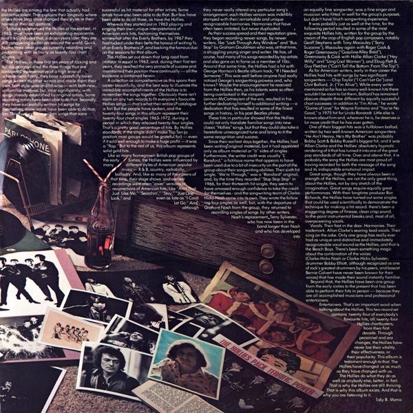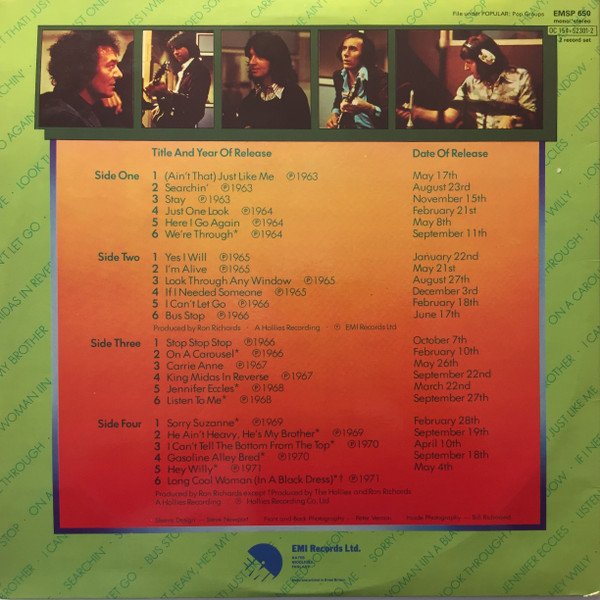 ℗ 1963 A1 to A3 ℗ 1964 A4 to A6 ℗ 1965 B1 to B4 ℗ 1966 B5 to C2 ℗ 1967 C3, C4 ℗ 1968 C5, C6 ℗ 1969 D1, D2 ℗ 1970 D3, D4 ℗ 1971 D5, D6 Back cover: ℗ Hollies Recording Co. Ltd. Made and printed in Great Britain. Labels: Made in Gt. Britain Record 1: ℗ EMI Records Limited Record 2: ℗ Hollies Recording Co. Ltd. Cat.# EMSP 650 on back cover & spine. Cat.# 0C 154-52301-2 (boxed) on back cover. Cat.#s EMI 6501 / EMI 6502 on labels of record 1 and 2 respectively. Gatefold. Runouts are stamped except for BLAIRS, BLAIRS CUT and NICE ONE etchings. In variant 3 X overlaps R.