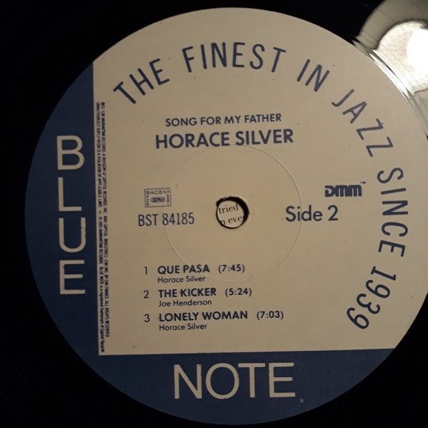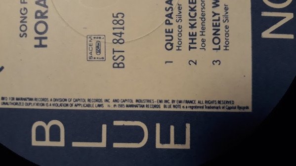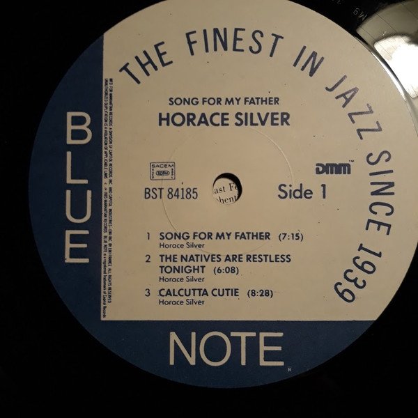 Originally released in 1963 BST 84185 on spine, back sleeve and labels 84185 on front sleeve Pressed in France and printed in Holland by EMI Services Benelux B.V., Uden Direct Metal Mastering. On rear cover: ℗ © 1984 Manhattan Records, a division of Capitol Records, Inc. On labels (very small characters): © ℗ 1985 Manhattan Records Probably pressed 1987 considering matrix Nr. on runout. For a similar release with cover printed in France, see [url=https://www.discogs.com/The-Horace-Silver-Quintet-Song-For-My-Father-Cantiga-Para-Meu-Pai/release/1875169]here[/url] Publishers: A1 to B1, B3: Ecaroh Music Inc. - ASCAP B2: Blue Horizon Music, Inc. - BMI Runouts are stamped, only the identifiers for [a3682147] (JCP on side A and P on side B) are etched.