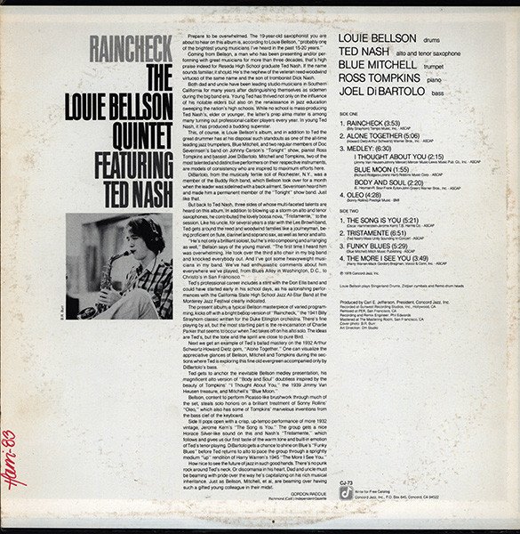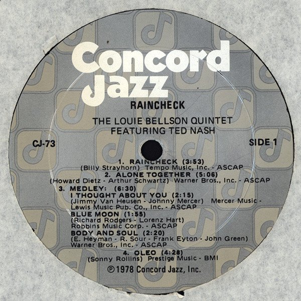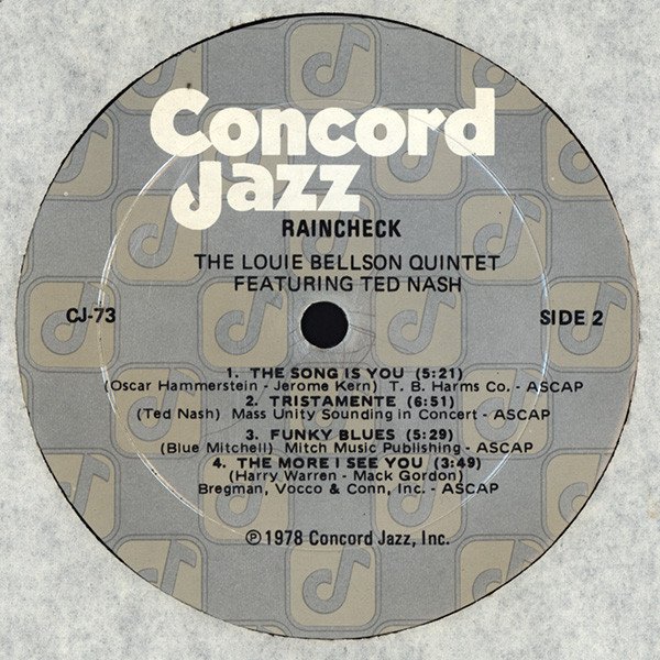 Label variation on multi-note silver label. ℗ 1978 Concord Jazz, Inc. Louis Bellson plays Slingerland Drums, Zildjian cymbals and Remo drum heads.