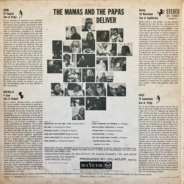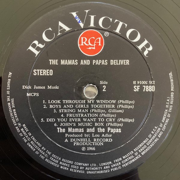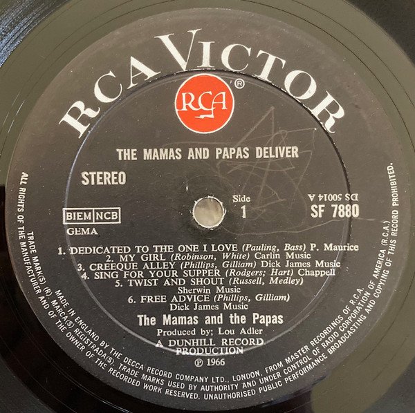 Front laminated sleeve. First cat.# on cover, 2nd on labels. Produced by DUNHILL RECORDS, U.S.A. A DUNHILL RECORD PRODUCTION ℗ 1966 © 1967 Radio Corporation of America. Printed in England. Title appears as: • "The Mamas & The Papas Deliver" on cover front; • "The Mamas & Papas Deliver" on cover spine; • "The Mamas And The Papas Deliver" on cover back; • "The Mamas And Papas Deliver" on labels. B2 appears as "Boys & Girls Together" on cover, but as "Boys And Girls Together" on label. Publishing: • P. Maurice - A1. • Carlin Music - A2. • Dick James Music - A3, A6, B1 to B6. • Chappell - A4. • Sherwin Music - A5. Runouts are stamped. Matrix # on labels appear upside-down.